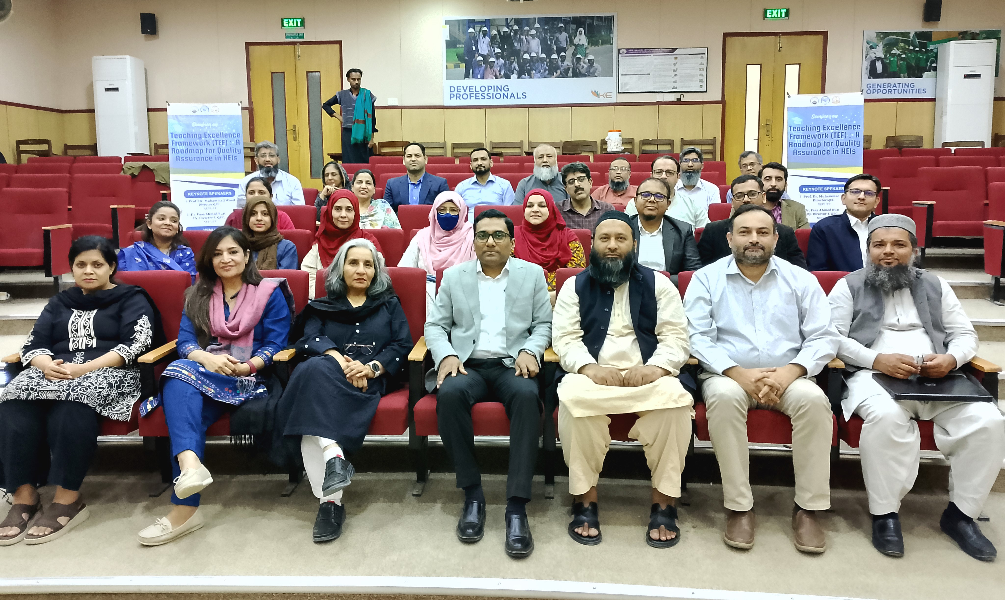 The Quality Enhancement Cell (QEC) of NED University of Engineering and Technology organized a seminar titled “Teaching Excellence Framework (TEF): A Roadmap for Quality Assurance in HEIs” on December 23, 2025. The seminar aimed to Enhance pedagogical skills, integration of technology in teaching, promoting inclusive and student-centered teaching, assessment and feedback for continuous improvement and fostering reflective practice and professional growth. The event was attended by chairpersons and senior faculty members from various academic departments of NED University, as well as representatives from QECs of other universities/ institutions. The featured speaker included Prof. Dr. Muhammad Wasif, Director QEC at NED University of Engineering and Technology.